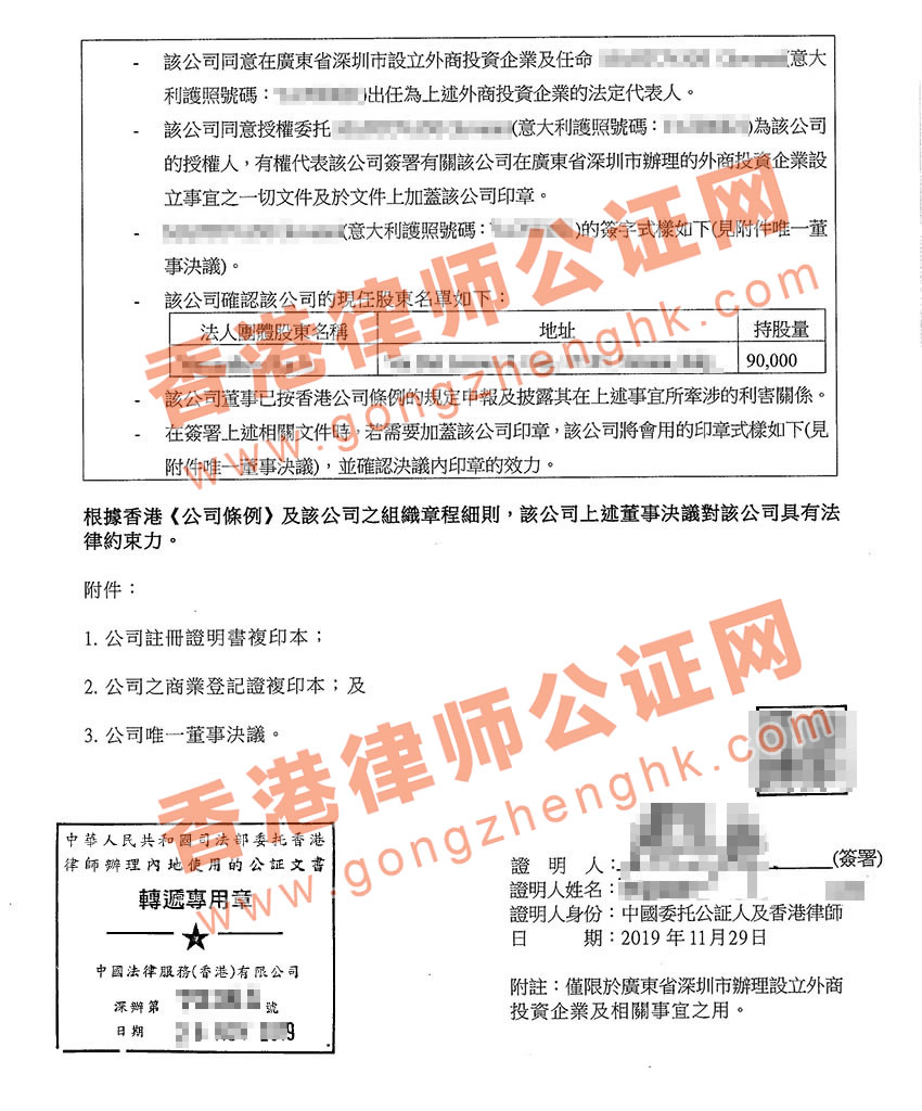 香港公司公證用于深圳設(shè)立公司之公證樣本
