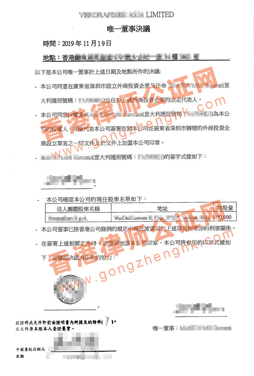 - 香港公司唯一董事決議證明;