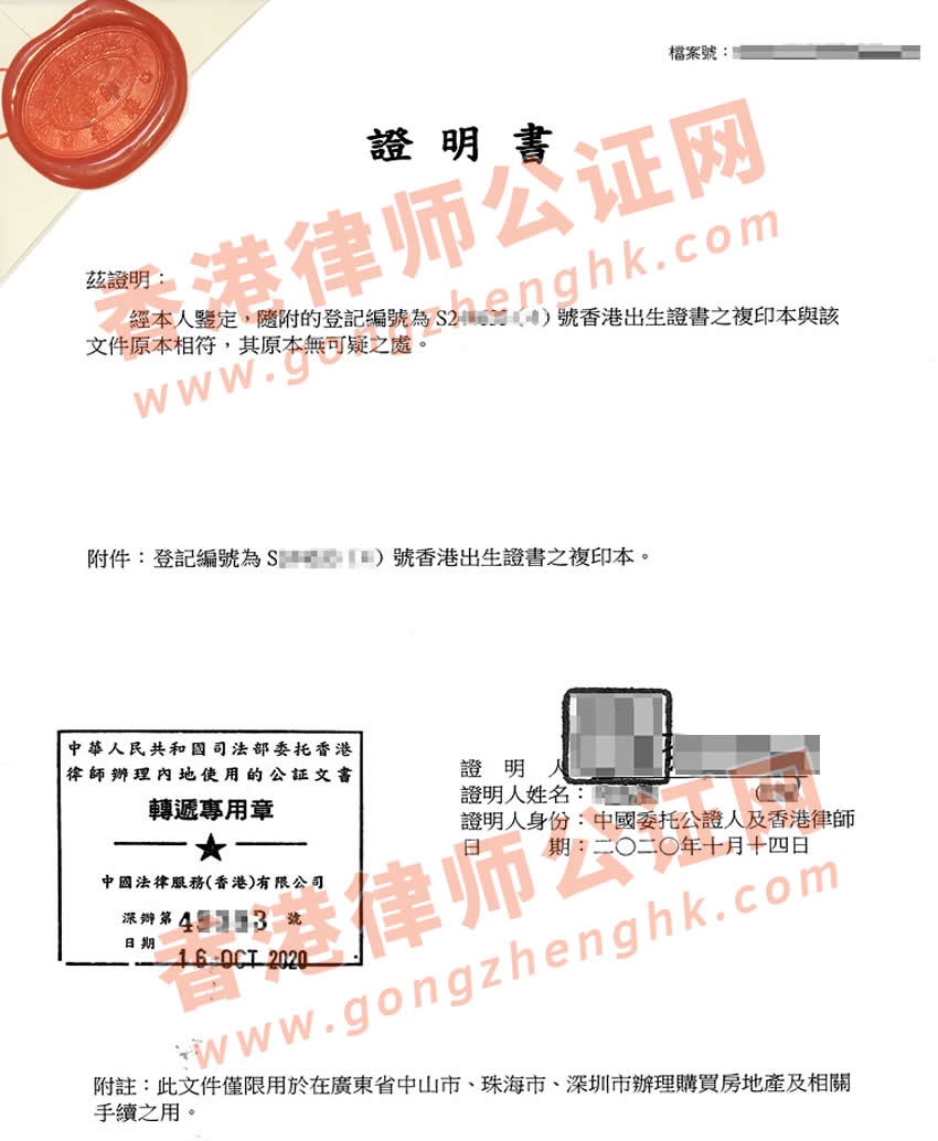 香港出生紙公證用于大陸多地購買房產(chǎn)樣本