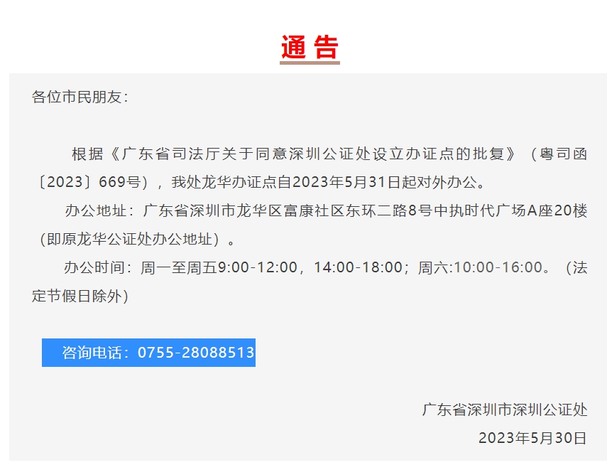 各位市民朋友:根據(jù)《廣東省司法廳關(guān)于同意深圳公證處設立辦證點的批復》(粵司函〔2023〕669號),我處龍華辦證點自2023年5月31日起對外辦公。辦公地址:廣東省深圳市龍華區(qū)富康社區(qū)東環(huán)二路8號中執(zhí)時代廣場A座20樓(即原龍華公證處辦公地址)。辦公時間:周一至周五9:00-12:00,14:00-18:00;周六:9:00-12:00,14:00-16:00。(法定節(jié)假日除外)咨詢電話:0755-28088513廣東省深圳市深圳公證處2023年5月30日